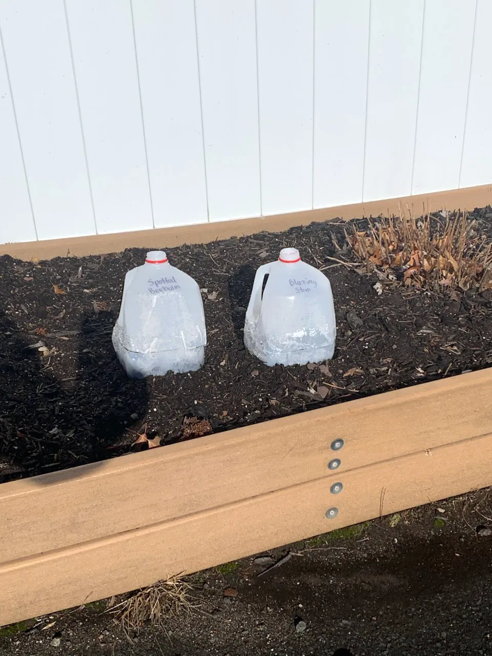 Before you begin, ideally you will choose from a wide variety of pollinating plant seeds. Choose plants that are native to your region, blooming from early spring into late fall. I planted Spotted Bee Balm and Blazing Star. All you need to start the process are containers; clear plastic gallon milk or water jugs work best. Proper drainage for the seedlings is important, as well as leaving the cap off for water and snow to moisten your seeds to help keep them nourished.